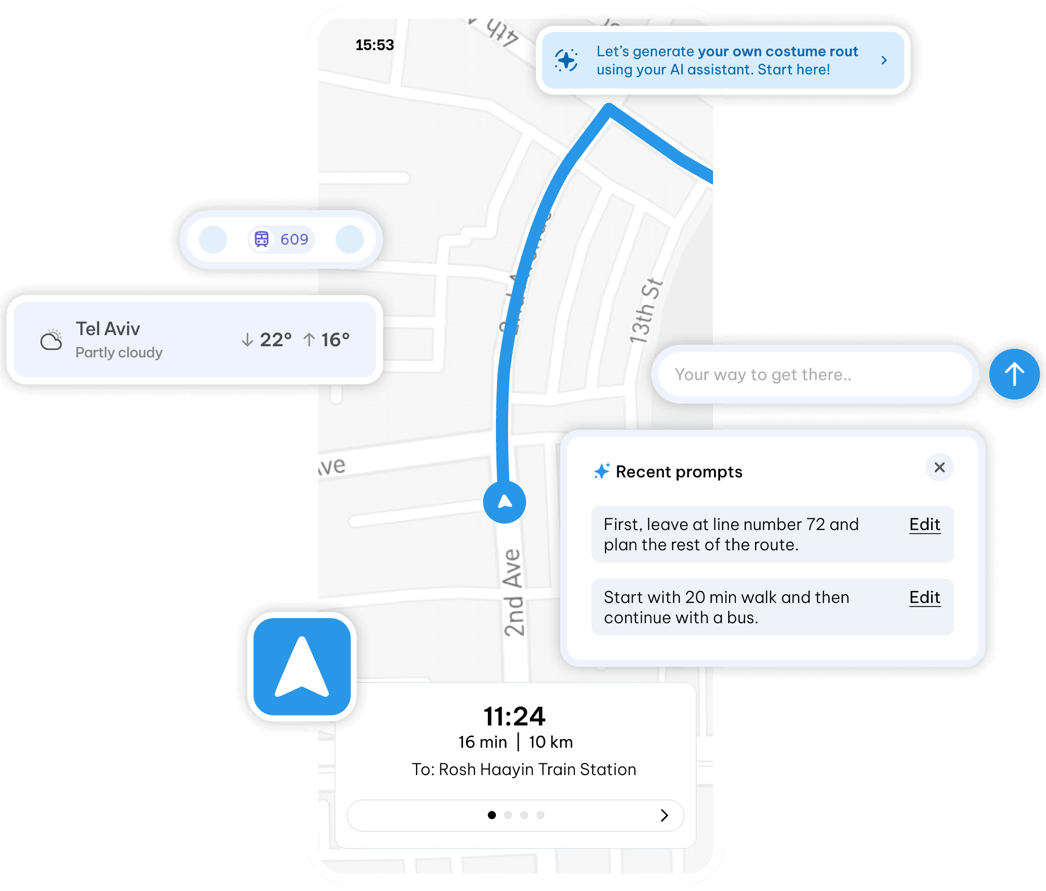 AI prompt with free text input. Generates a route based on the user’s prompt.