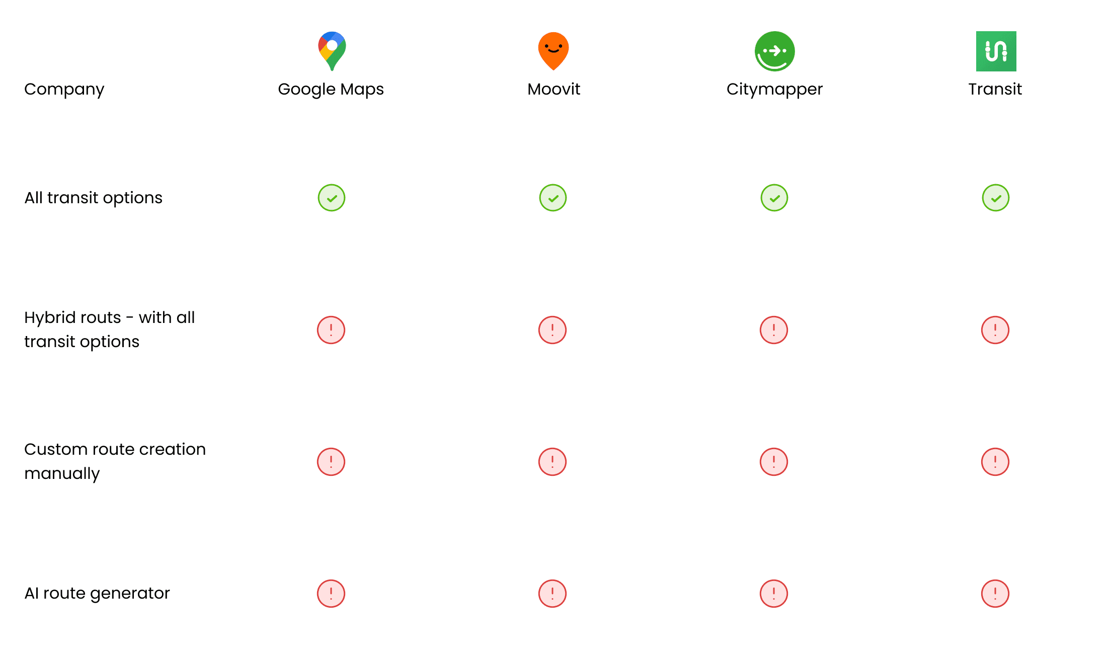 Although all apps offer fast and accurate navigation across most transport modes, they provide limited control and personalization for users planning routes.